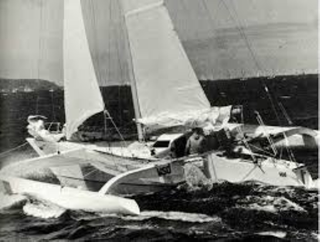 Eugene Riguidel is a French yachtsman who was an early convert to racing trimarans. In 1975 he raced a 33 foot Crowther Kraken 33 in the AZAB race finishing second to Nick Keig in the 37 foot Three Legs of Mann. He went to Derek Kelsall with his sponsor the French magazine VSD. He campaigned three successful designs from Derek Kelsall. VSD1 was a development of the GBIV design and Eugene lost her at the end of the Route De Rhumb race in 1978 when he ran aground on the reefs of Barbuda just before arriving in Guadeloupe. A replacement VSD 2 followed this development on with larger floats, and more protection in the cockpit, extensions for the bunks on the main hull. He competed in the 1979 Transat en Double two handed transatlantic winning the race. The boat was then fitted with foils on the rudder and main hull. In 1980 an attempt on the New York to the lizard record ended with the boat tripping over its foils as it surfed down a wave and pitch poling. Its is thought that the foils buried at the wrong angle as the wave was so steep and the stern was lifted, so the bows failed to lift because of the foils His OSTAR 1980 was also dogged by bad luck namely loss of the centre board after 10 days and finishing 19th in 24 days. Under a variety of name this boat entered many races and competed in an Atlantic record attempt again. Her racing career over in 1987 she was sold and in 1997 was found abandoned in the Balearic Islands. Restored by Stuart Rogerson she sailed the Atlantic several times and had a great renaissance under owner Stuart Rogerson until her loss in 2018. Finally Eugene commissioned an 88 foot trimaran from Derek Kelsall called the William Saurin in 1983. She was the pinnacle of Derek's racing design career and again the largest trimaran in the World. After her racing career ended the trimaran renamed Safir became a charter vessel. Today Eugene is a keen environmentalist and campaigner.