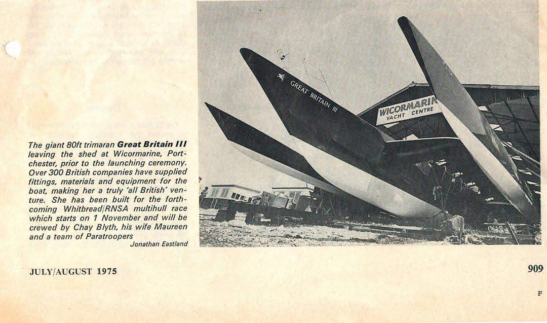 Designed to sail around the World she was the World's largest trimaran. After some inevitable teething problems Chay sailed her across the Atlantic from Cape Verde to the West Indies in a record time of 10 days and back from New York in 13 days. The size and manoeuvrability were a struggle for Rob James who sailed her for Chay Blyth in charter work. Chay's luck ran out when he sailed her single handed when he had a collision with a ship off Dartmouth. This cut off the port outrigger bow and flooded the port hull with the result that he capsized her. She was rebuilt she was sold and went on to do charters and competed in the 1978 Route du Rhum under the name of Disque d'or II in the hands of Pierre Felhmann. Another transatlantic voyage and racing followed in 1980 in Antigua. Renamed Black Condor she was abandoned in the Italian port of Castelliamare where she was used as a floating pontoon and net dryer for local fishermen Eventually after a big refit in Italy in 1984, she was in American ownership destined for charter in the Caribbean back under her original name. It seems she had been structurally altered for luxury and apparently grossly overloaded on her delivery voyage the crew abandoned her after she started filling with water, believing that she was sinking. The last picture below was taken from a Portuguese fishing boat that was taking off the skipper and his delivery crew. She ended her days upside down on a beach in Morocco (according to Derek) and bits of her may well still be there although other accounts suggest she was rammed by a cargo ship and destroyed after she was abandoned.