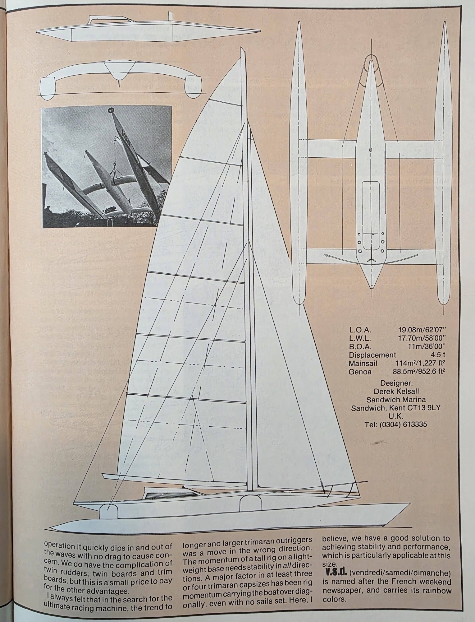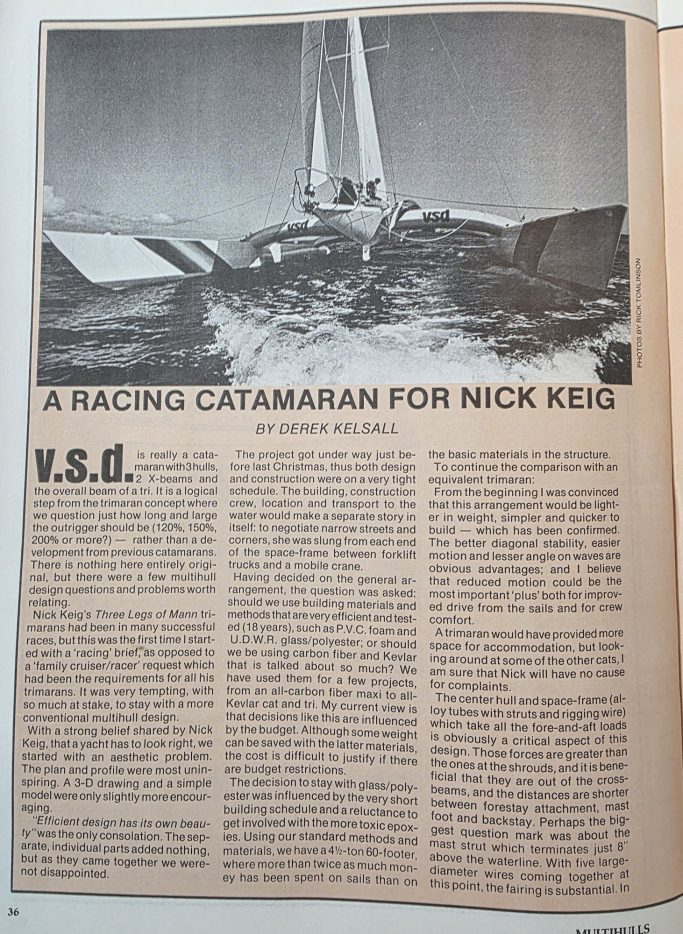 After Nick Keig sold Three Legs of Mann III in 1983 he embarked on a pure racing catamaran. In this design Derek effectively changed the trimaran concept by enlarging the floats and the main hull became a suspended nacelle in the middle. Derek felt that the boat that was completed with French sponsorship was one of his best designs because it was so fast. Sadly she never realised the potential. Dismasted on the eve of the Transat En Double sailed by Keig and Gilles GAHINET. She was bought by VSD and extensively modified to shorten her to be eligible for the OSTAR sailed by French star Michel Malinovski. En route to Plymouth she capsized. Used as a charter boat she was lost in 1993 after a collision in a gale. In many ways this was a design that like GB III and William Saurin was ahead of its time. A brilliant concept.