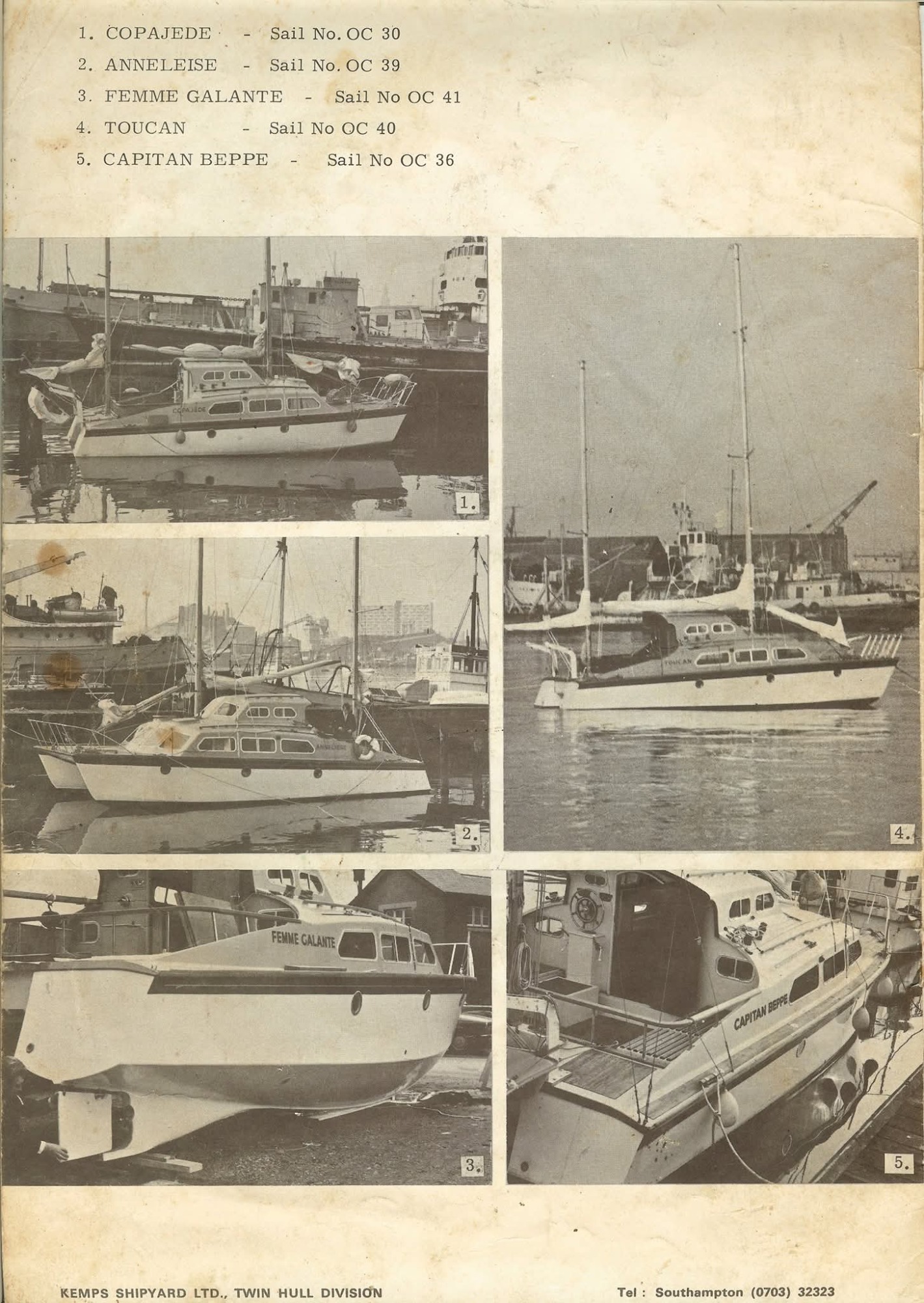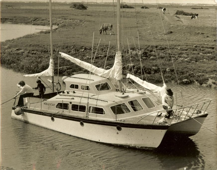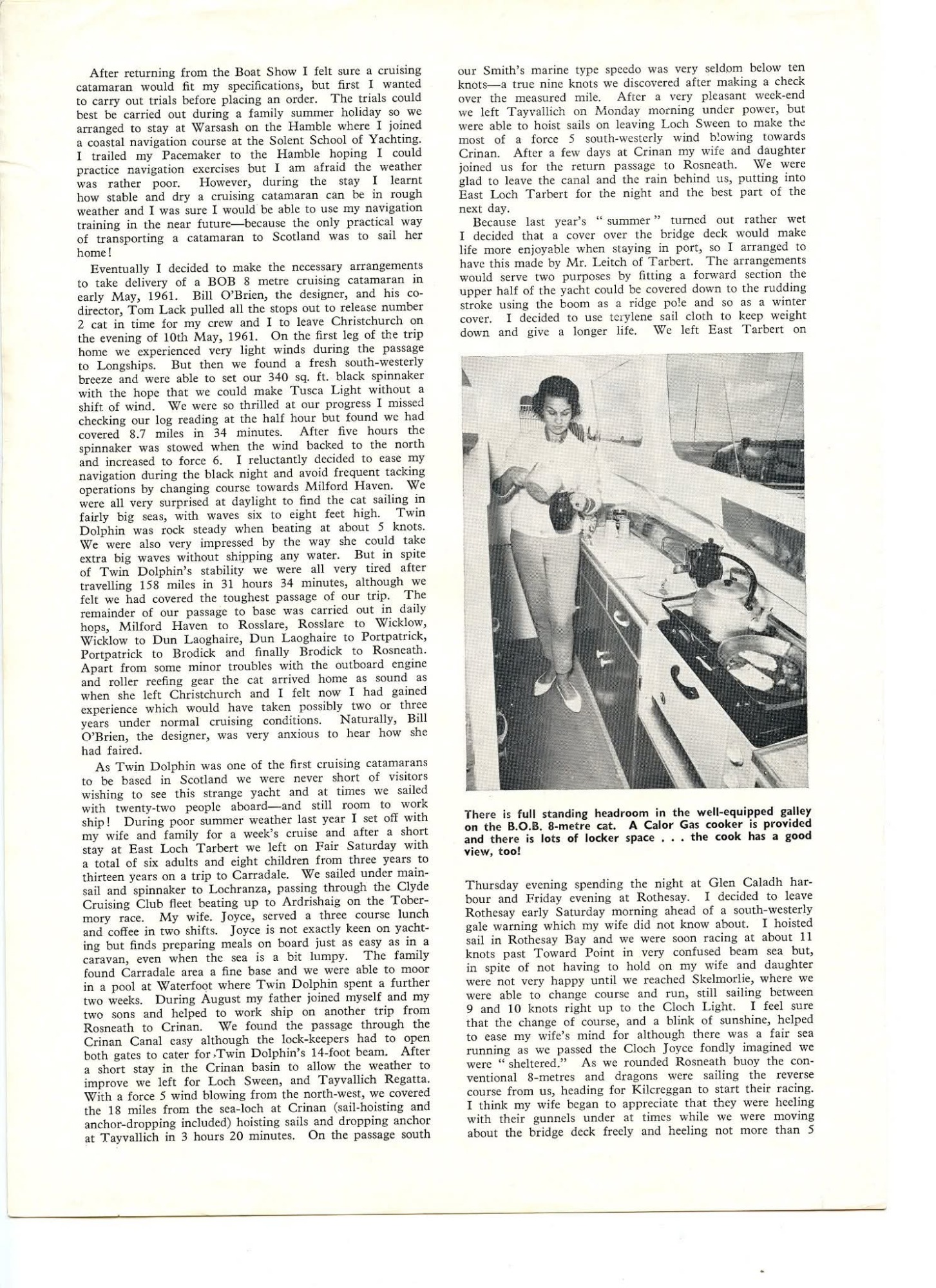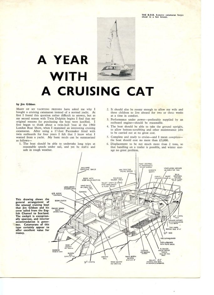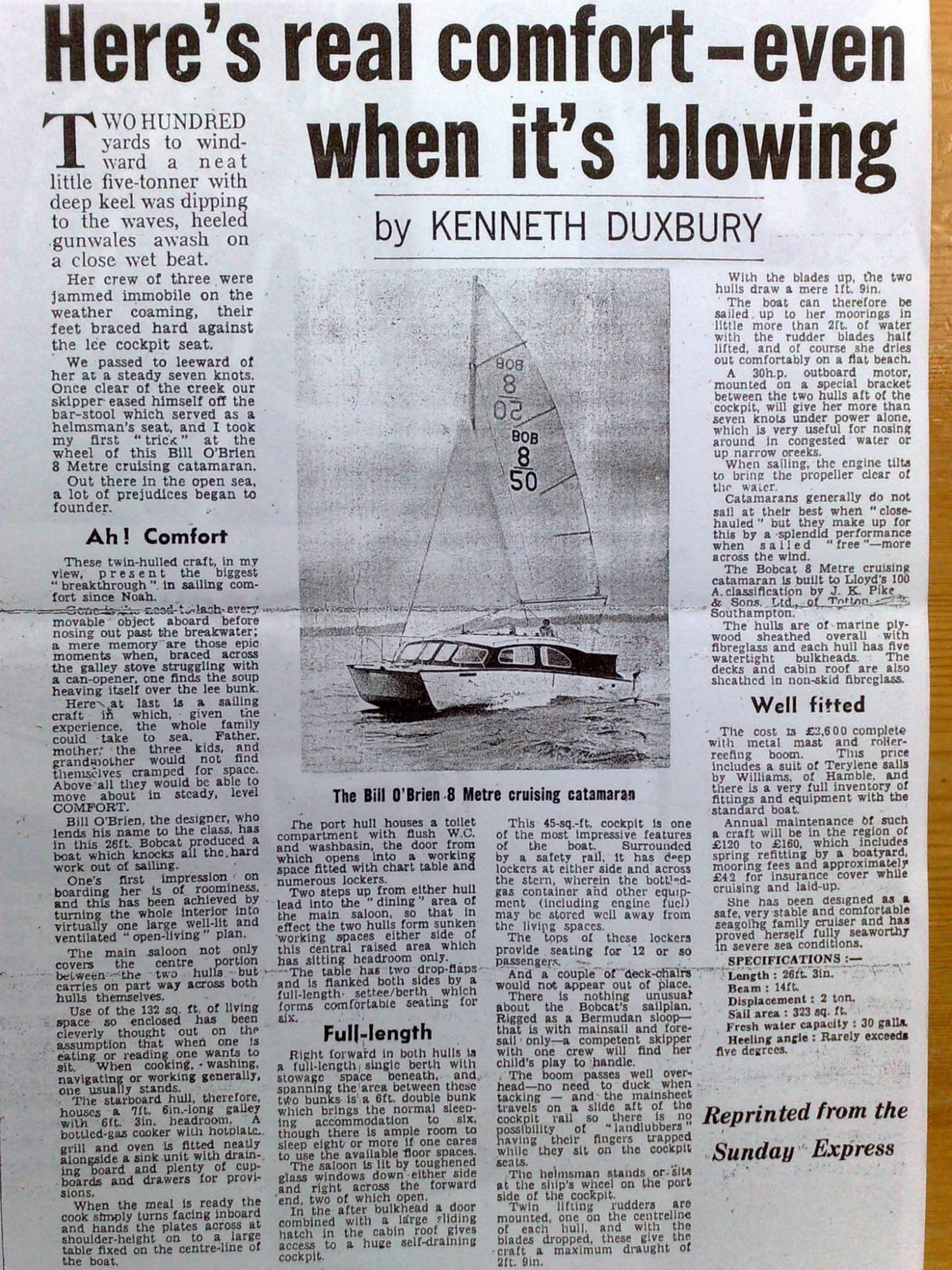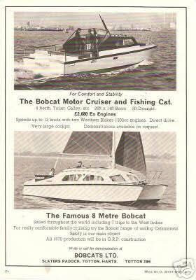 His first production cruising catamaran design was the 22 foot Shamrock built by Hawker Siddeley Hamble Ltd where bill was employed as a naval architect. He then started his own company selling Bobcats which were popular family cruisers at 8 metres and 10 metres. Built solidly in timber and sheathed ply they had an energetic sales force in Tom Lack and his family. More than 200 were sold. Later Tom Lack set up his own successful business with a range of grp catamarans called Catalacs. they followed a similar patten to the Bobcat with "v" chined hulls and full bridgedeck, low rigs and very high stability.