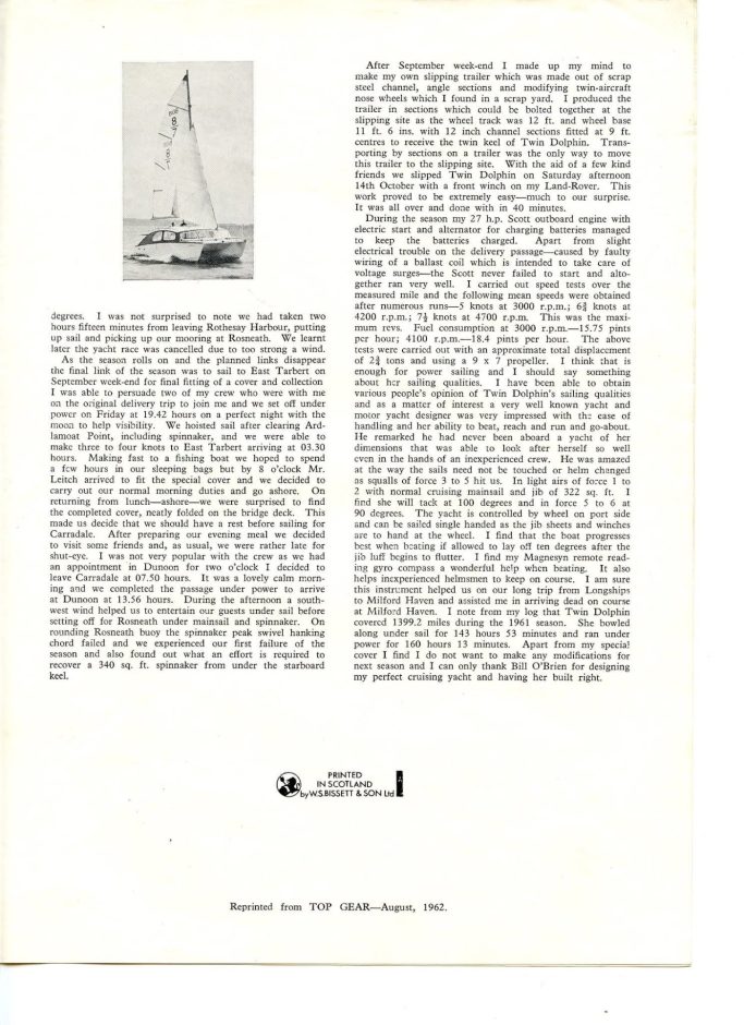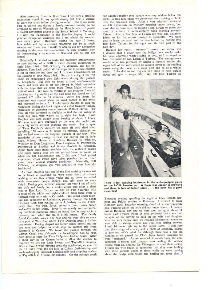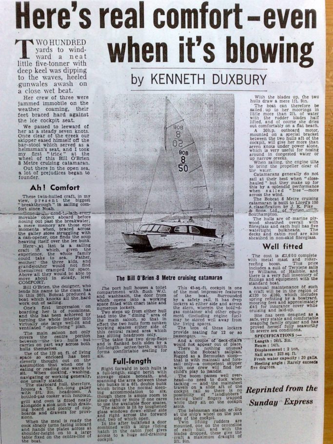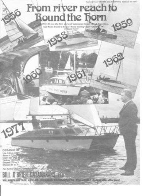 Bill O'Brien was a catamaran designer. It was said that he built his first by lashing two pig trough's together aged 7. Born in Dublin in 1920, Bill grew up on a farm in the Irish town of Carlow.