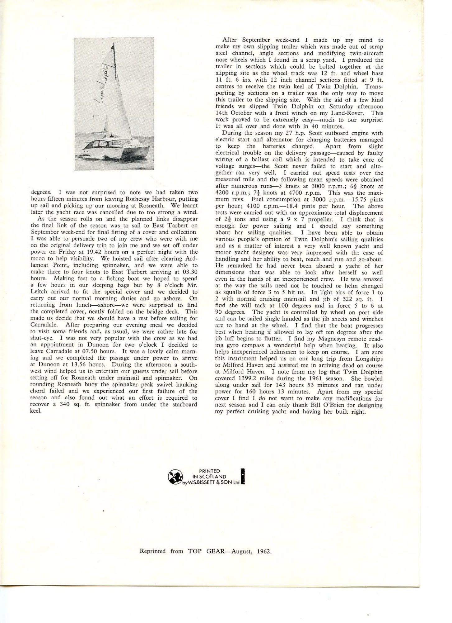 During this time he designed and launched the catamaran class Jumpahead. The JUMPAHEAD was introduced at about the same time as the Prout SHEARWATER, and was one of the earliest 'production' catamarans from the UK. It is thought that several hundred were built. In the early 1960's, a very few of a fiberglass version were built by Grampian Marine. Originally drawn in 1946 Jumpahead was launched as a class which Bill pioneered seeking support from the Prouts and others to get catamaran racing started in the UK in the 1950's.